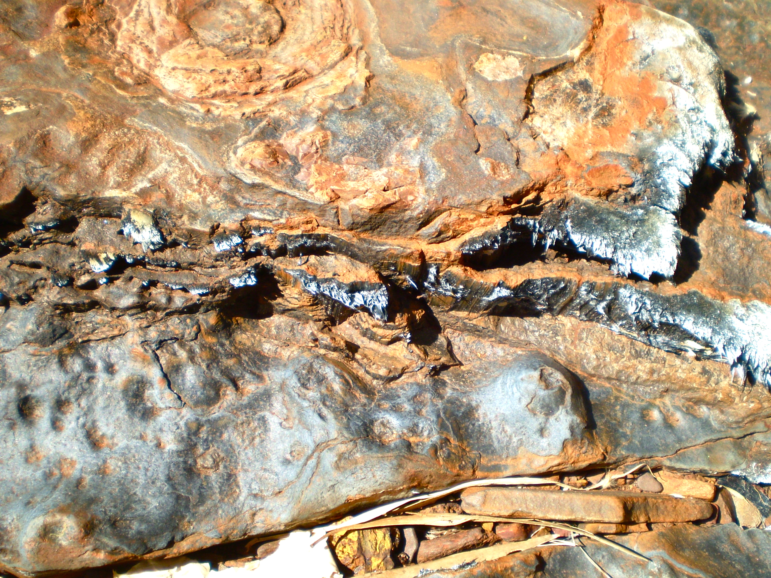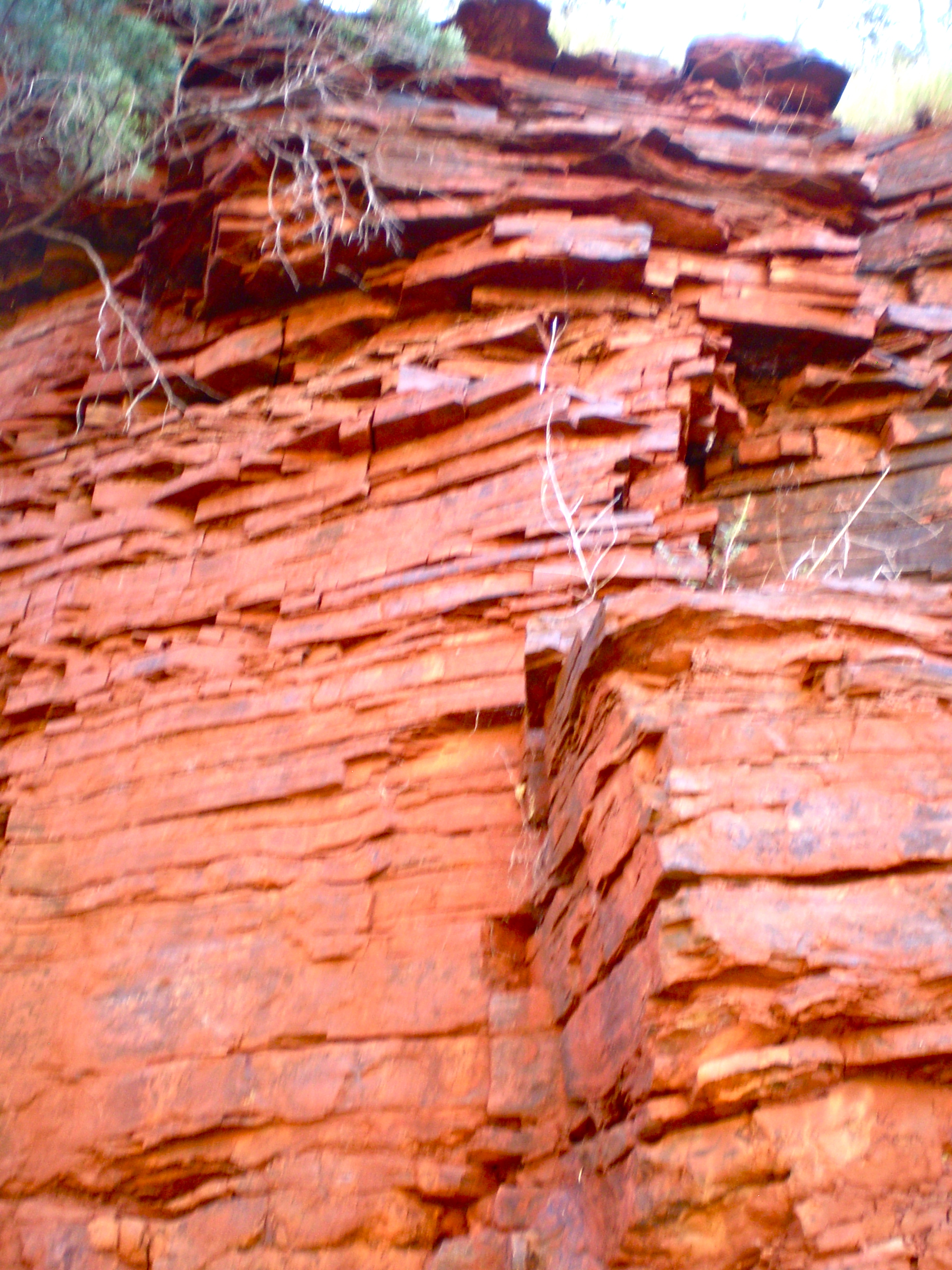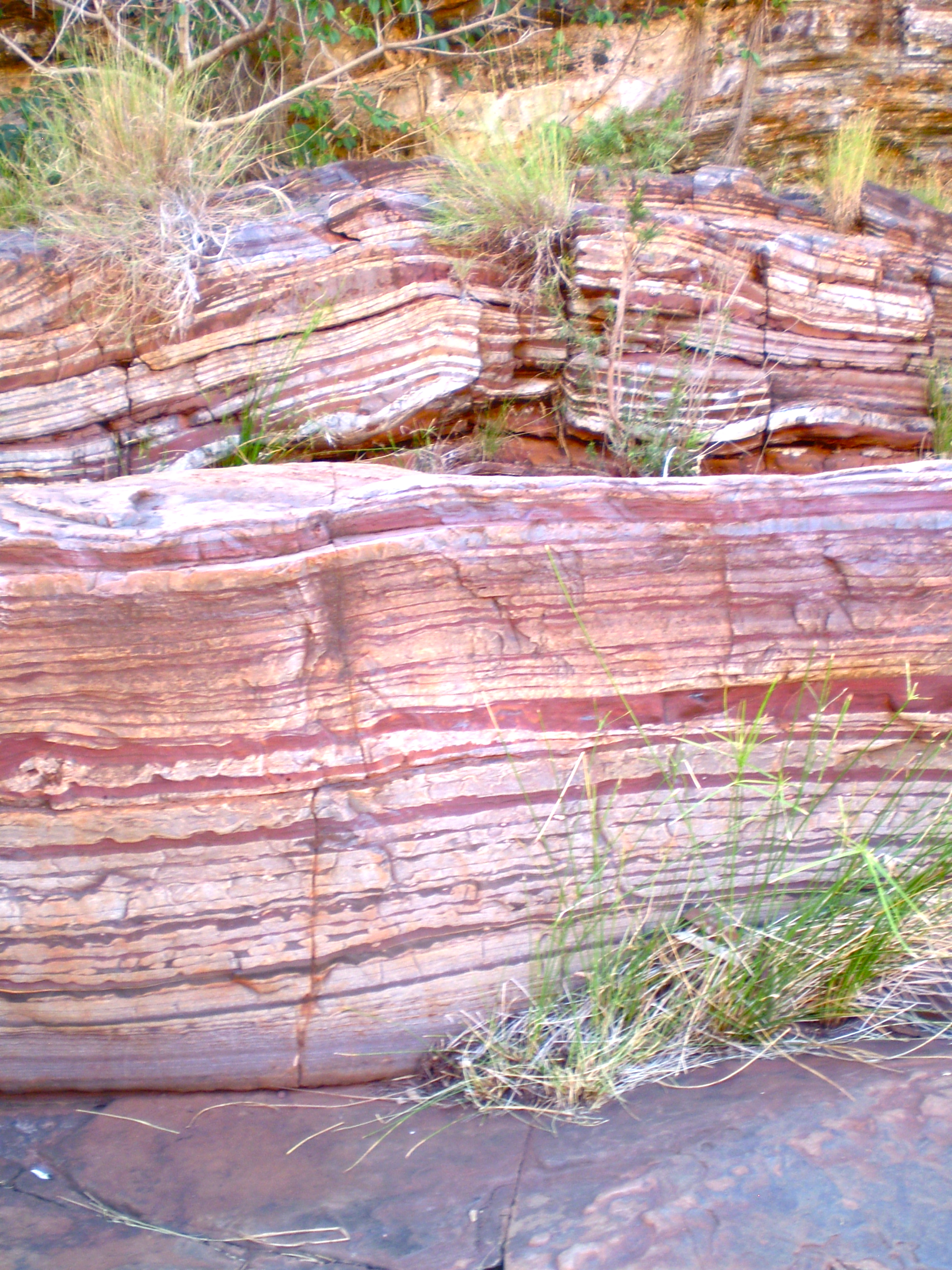 The gradual deposition of sediment and of rock layering record a time during the Archean when there was little oxygen in the atmosphere and the only life forms were bacteria and algae. Banded iron formation rich in iron and silica, while not fully understood, is thought deposited by cyanobacteria (blue-green algae). Some forms of bacteria drew their energy from the earth via thermal activity near volcanoes. Others like the ones at Hamelin Pool, 3.5 billion years old, drew theirs from sunlight through photosynthesis. Iron derived from volcanic activity survived in the ocean which could have been red-brown colour such as the inland sea known as the Hamersley Basin. The earth’s atmosphere was only thought to be about 1% oxygen and as more oxygen entered the earth’s atmosphere it probably hastened the rusting and sedimentation of the iron laden ocean into this basin for 350 million years. This process and the period of time involved appear to have occurred through an unusually long stable period seen by the formation of up to 100 meter deep horizontal layers of banded iron in parts of the gorges.