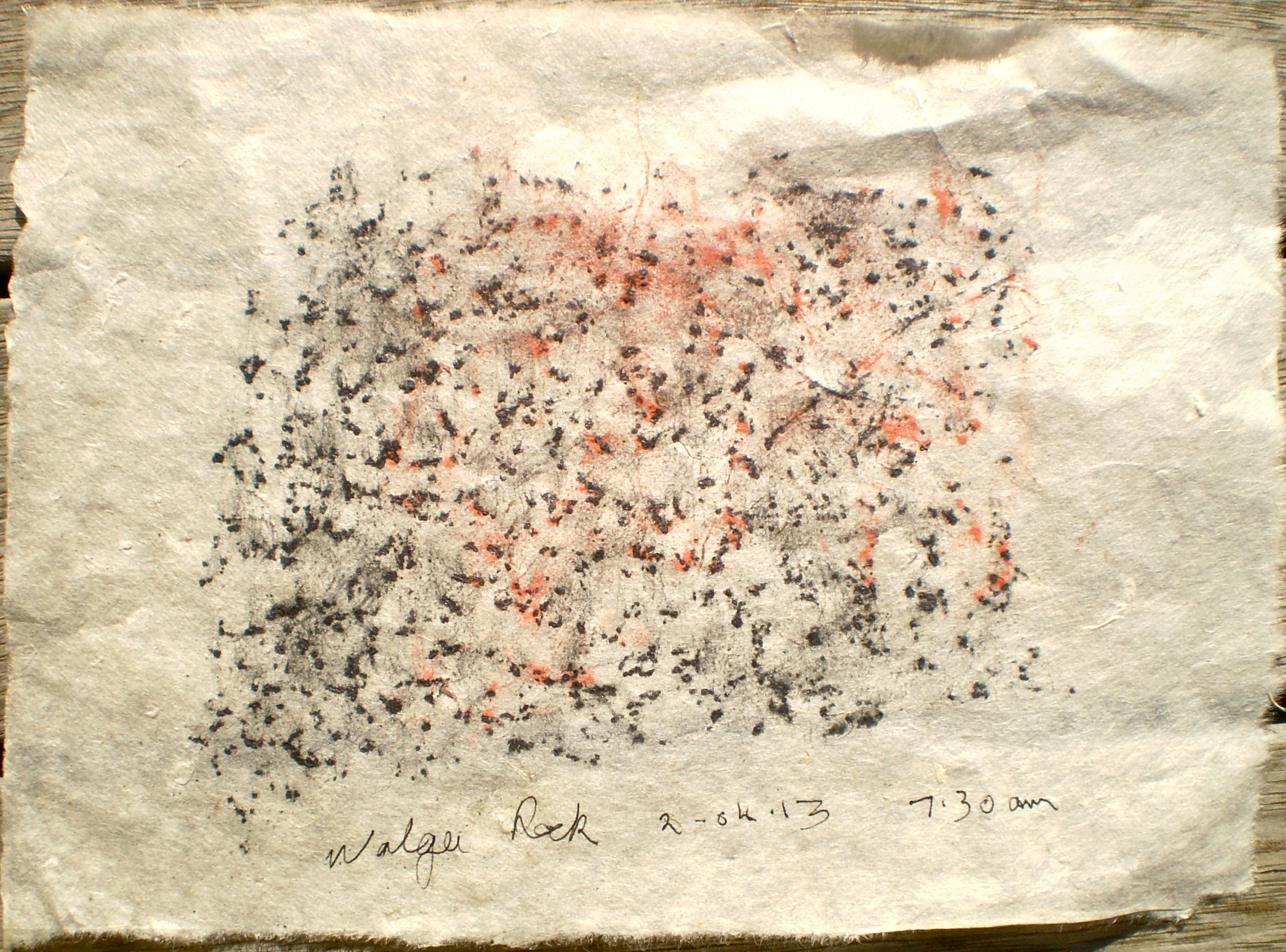 I took a rubbing/frottage from rocks as well as rice paper stains from soil far from the enclosure. They are a way for me to connect with the place via a tactile experience when I return to my studio. Often I adhere them with gesso to the canvas surface.