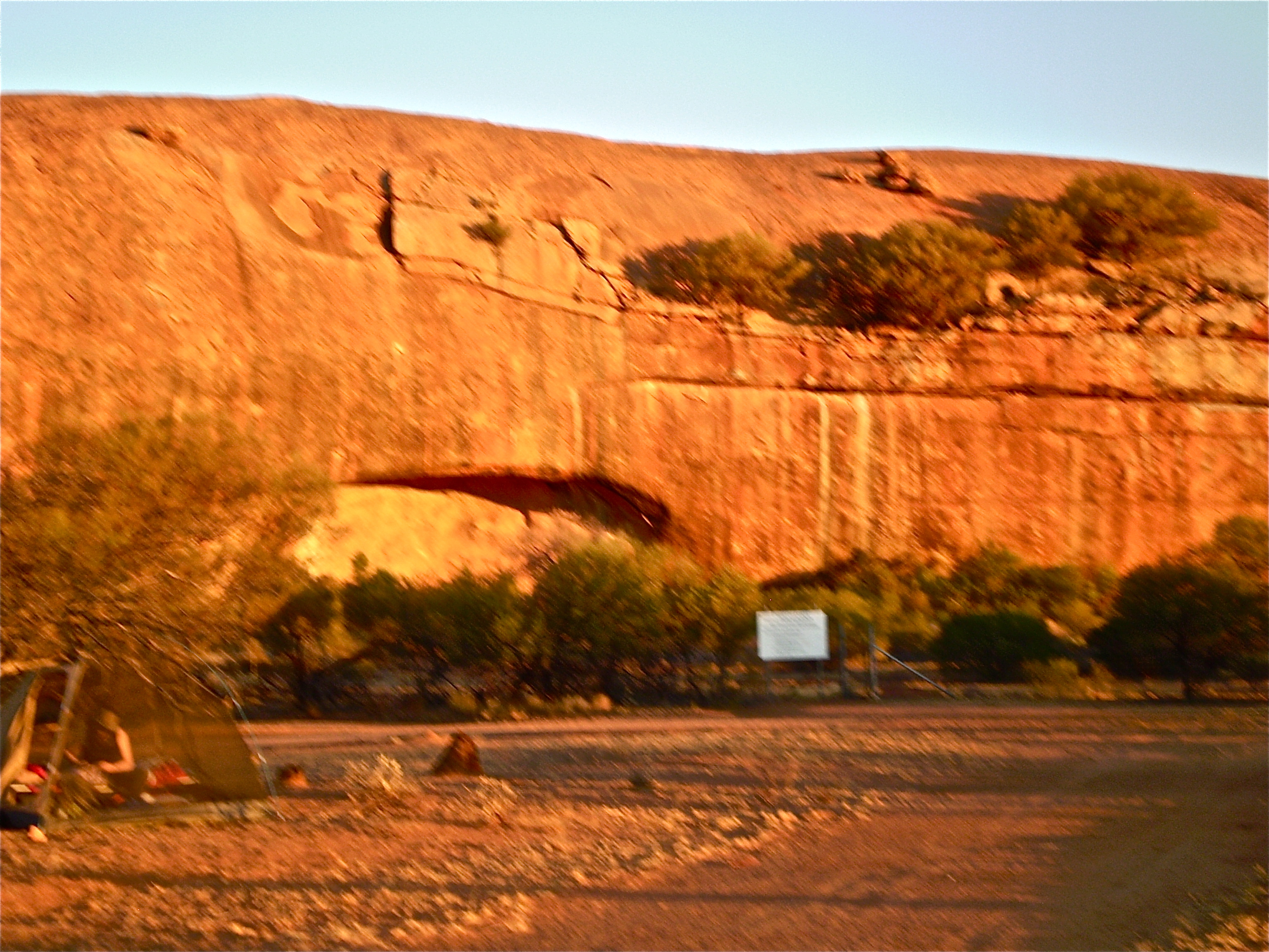 Above the gallery situated on the cave wall are large slabs of granite in the process of ‘peeling off’ the main rock form. This process is caused by expansion and contraction of the surface because of extreme seasonal and diurnal temperatures in this inland (300 km), arid climate. Rain water and wind erosion molded and eroded the lower recessed section of the rock.