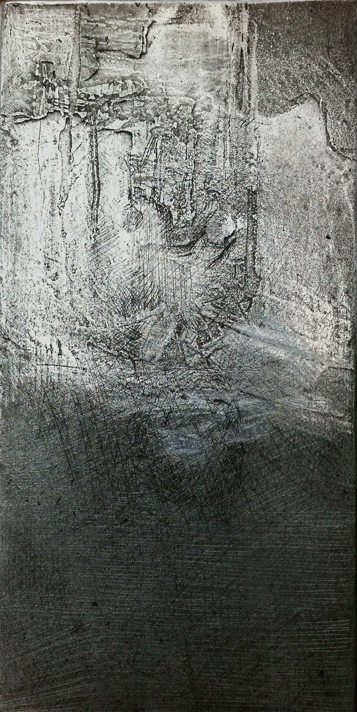 The top half of the plate already destroyed by open bite, burnish and drypoint balanced the drypoint bottom half.