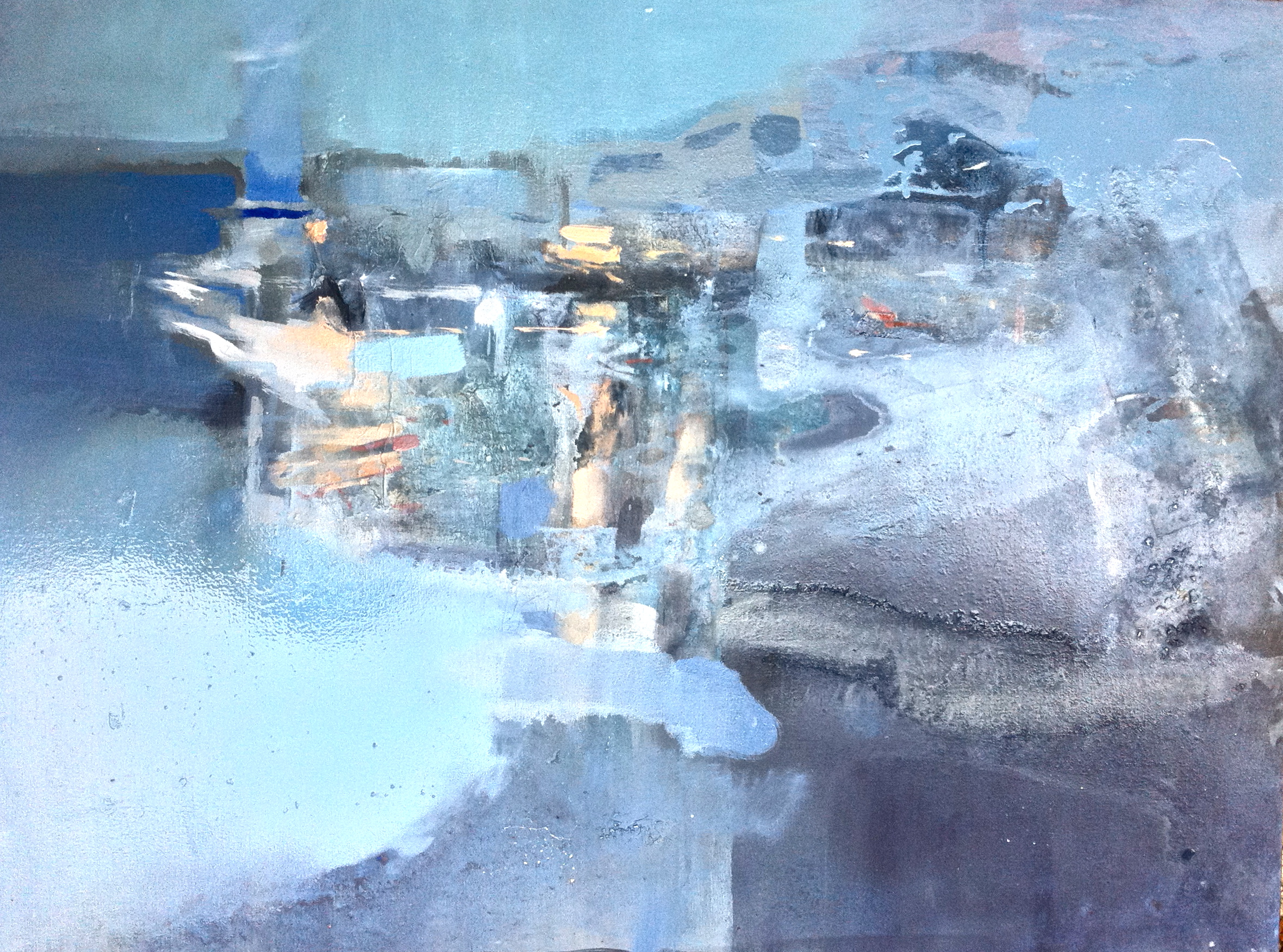 In these last layers I gradually intensified the colour however at present it is too colourful. I poured several wet in wet colours together hoping they would suggest reflection. Missing is the sense of shallow water although the illusion of varying depth is working. I want the paint fresher and crisper as well as mark making which is too furry in places. This will come about when I reintroduce grey tones that allow the colour breathing space. Line created with an oil painting stick may definite a statement directly.