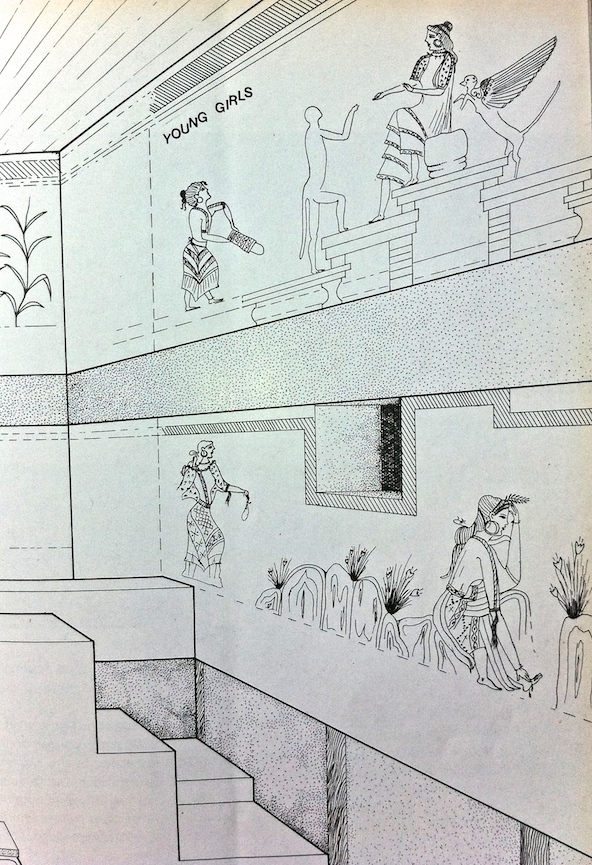 Briefly I referred to frescos that depicted a narrative ritual where women protagonists descend into an adyton (holy of holies) depicted within the architecture of the Thera excavation. The frescos make reference to the underworld, vegetation, growth and the cycle of nature as does the rape of Persephone and abduction to the underworld by her uncle Hades.