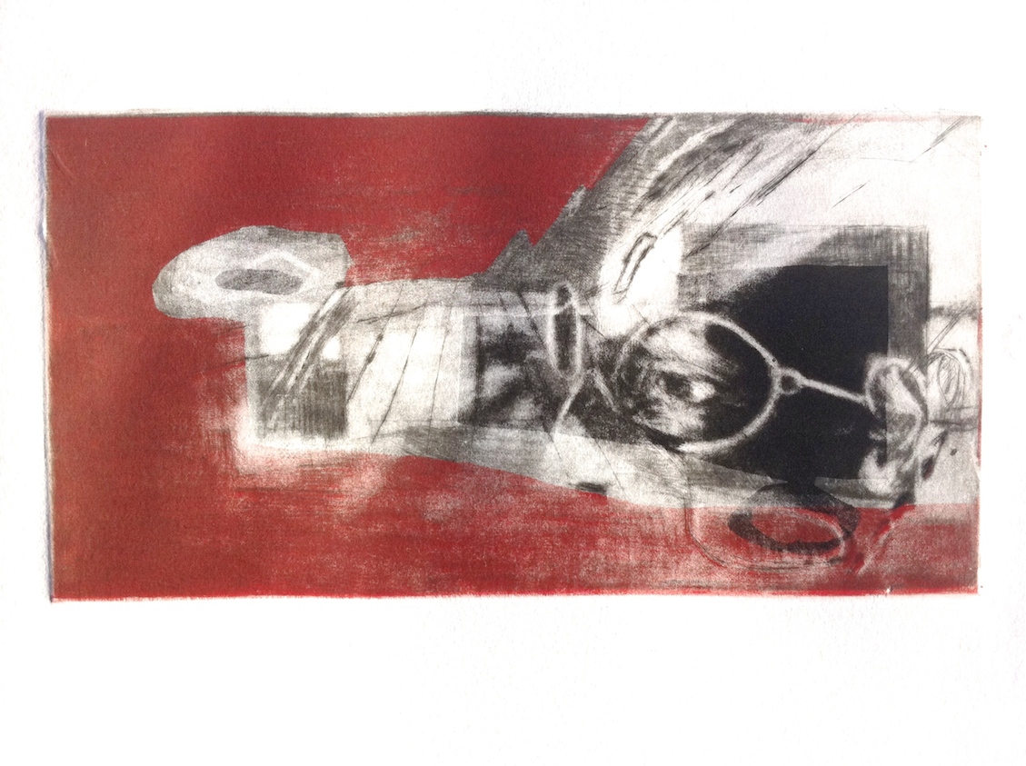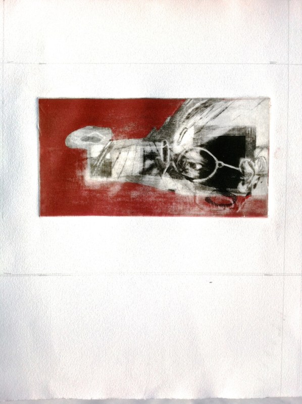 The light grey tone was the first, red second placed and registered over the grey and then the black area was printed last. I hadn’t done a drypoint using rollers and roulettes to get tonal areas as opposed to aquatint and etching with acid combined with masking out different areas of the composition. The result, which I’m still adjusting to, is more graphic than my usually painterly look especially without any chine-colle application.