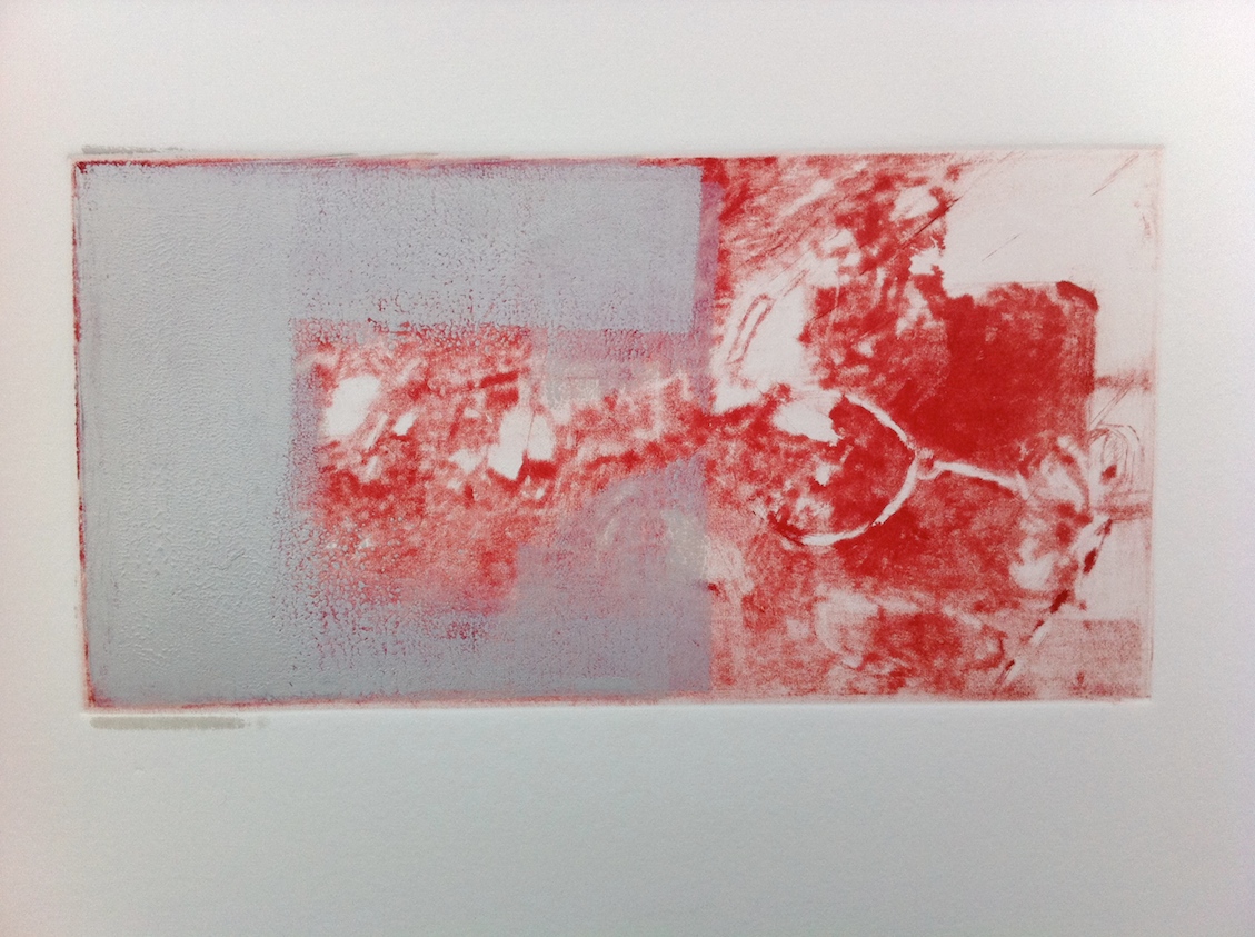 The first layer was a washy pink over which I printed red, black or grey and also a rolled grey area in 2 versions of the image. While I have not altered the original image etched on to the plate I have altered the colour placement by way of masking and roll up. I enjoy making different versions of the one image which results in a variable edition.