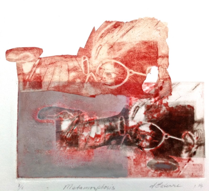 The slide show images, a variable edition of intaglio and chine colle, derive from the image below titled Search for the “Golden Spike”. The technique included masking out a section of the image when I inked and printed the second layer of the composition. The blank masked area received the ink from the etched surface in the second printing but was excess to requirement when printing the first etching. Later these ‘leftovers’ often combine with the first print as a way to create and develop further aspects of the composition. I did several mixing three colours and versions of the first image in different ways.