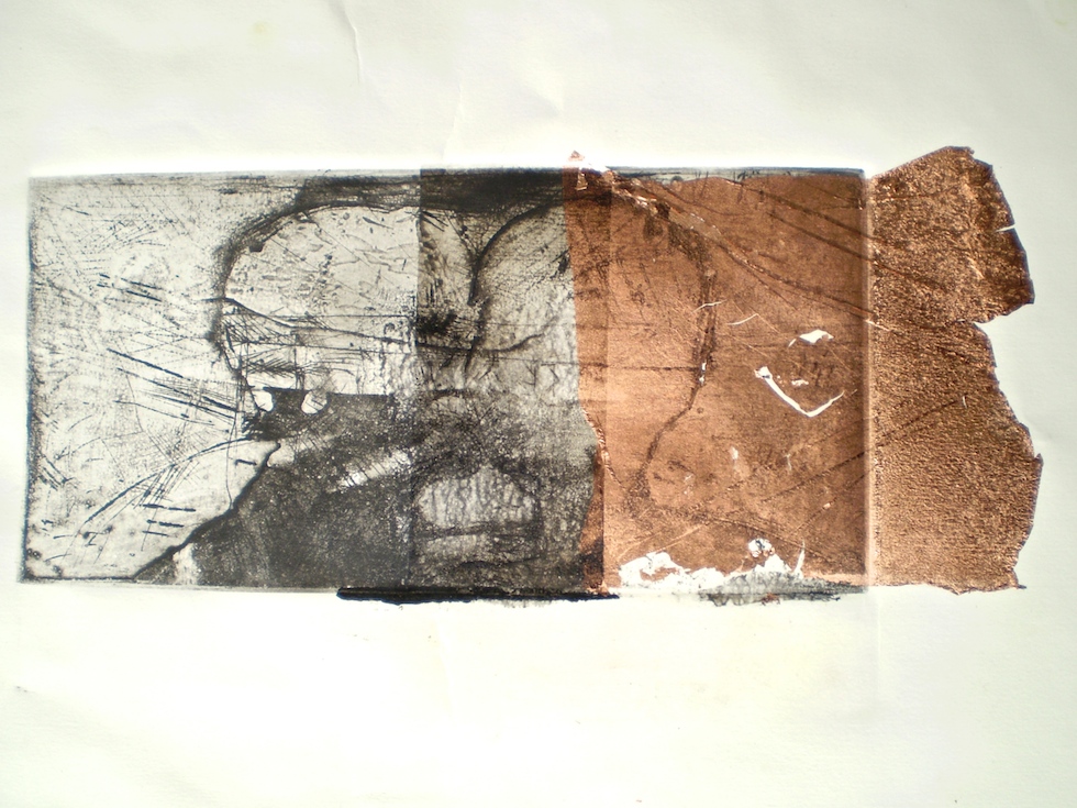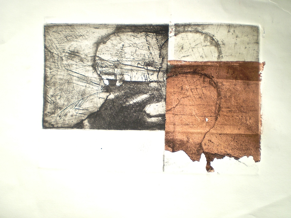 l ‘m not to sure about the last image but I was surprised at how the combination of etching and copper leaf produced an antique look that reminded me of maps from the sixteenth century, as though the shapes resembled fragments of lost continents. All the imperfections; torn edges, edges over lapping the plate embossed edge, decal and excess ink bleeding outside its boundary could have resembled an old parchment that may have been in an attic for a few centuries.