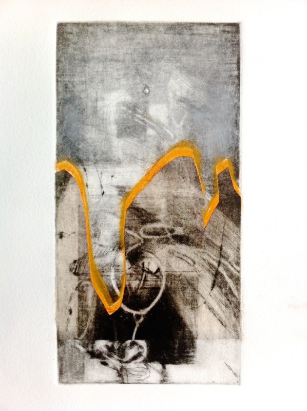 The second print shown here was proofed first and the first was the ‘improved’ version which was too fussy. I liked the more ethereal first effort. So I scraped off the top and part of the central ‘horizon’ , simplified the busy bits and added a chine colle.