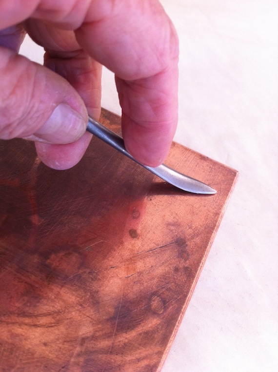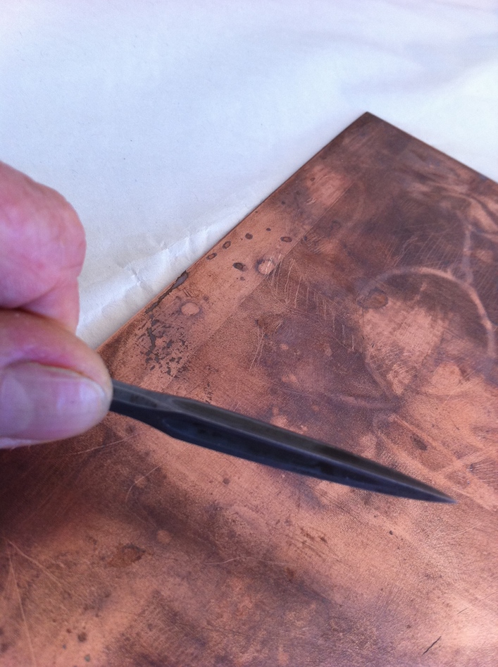 The dark areas in the earlier image were made using the aquatint and acid process.I wanted to try out a new tool that creates darkened areas and is called a rocker which doesn’t require an acid bath. Basically its a drypoint method called mezzotint.