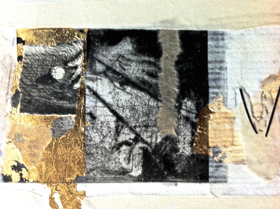 I have continued combining metallic leaf, handmade papers and intaglio with some intaglio as collage.