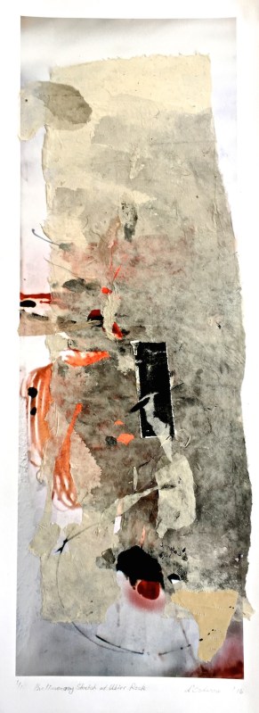 In Preliminary Sketch at Ubirr Rock, 2016 an ink washed piece of rice paper became the first layer into which I carved different shapes again revealing glimpses of the print beneath. The simplicity provided by the textured and slightly tonally graded rice paper alluded to rocky texture with out being too literal. Once again less was more.