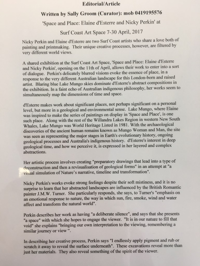 The exhibition opening was successful with sales and inquiring comments, a poetry reading by Patricia Sykes who composed a poem titled Desert Poet in response to one of my paintings and much discussion about ideas informing our work and the way that Curator Sally Groom created a visual dialogue between the images.