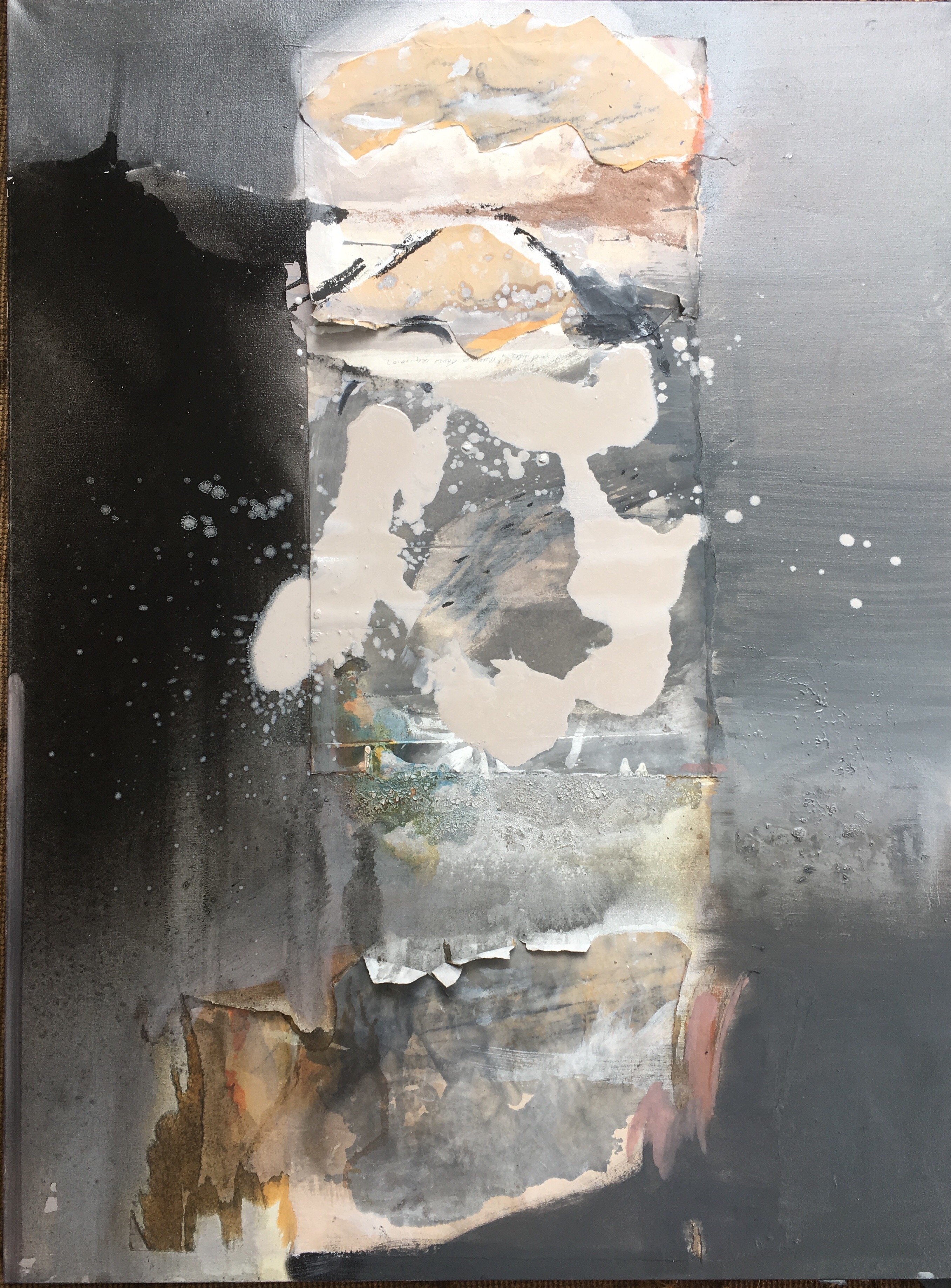 Layers beneath were thoroughly dry – frottage on art and printmaking paper glued with gesso containing some Indian ink for soft tone in areas then over painted with greys containing a little raw umber for cooler tones and warmed with the addition of Sanguine highlights.