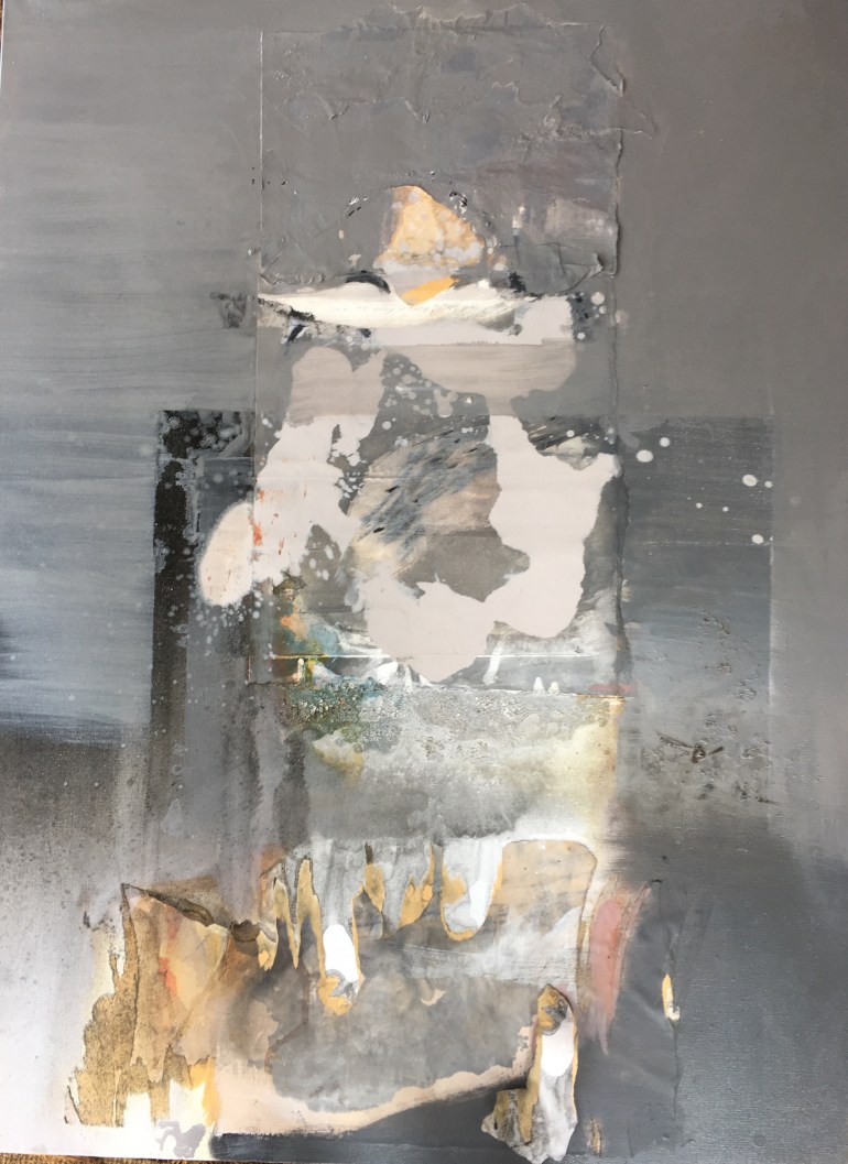 Top section of the composition was top heavy and needed some reduction and veiling. I mixed a grey with added red green and ultramarine in very small quantities making an earth -grey that I overpainted sides and top third of the composition obscuring shapes beneath.