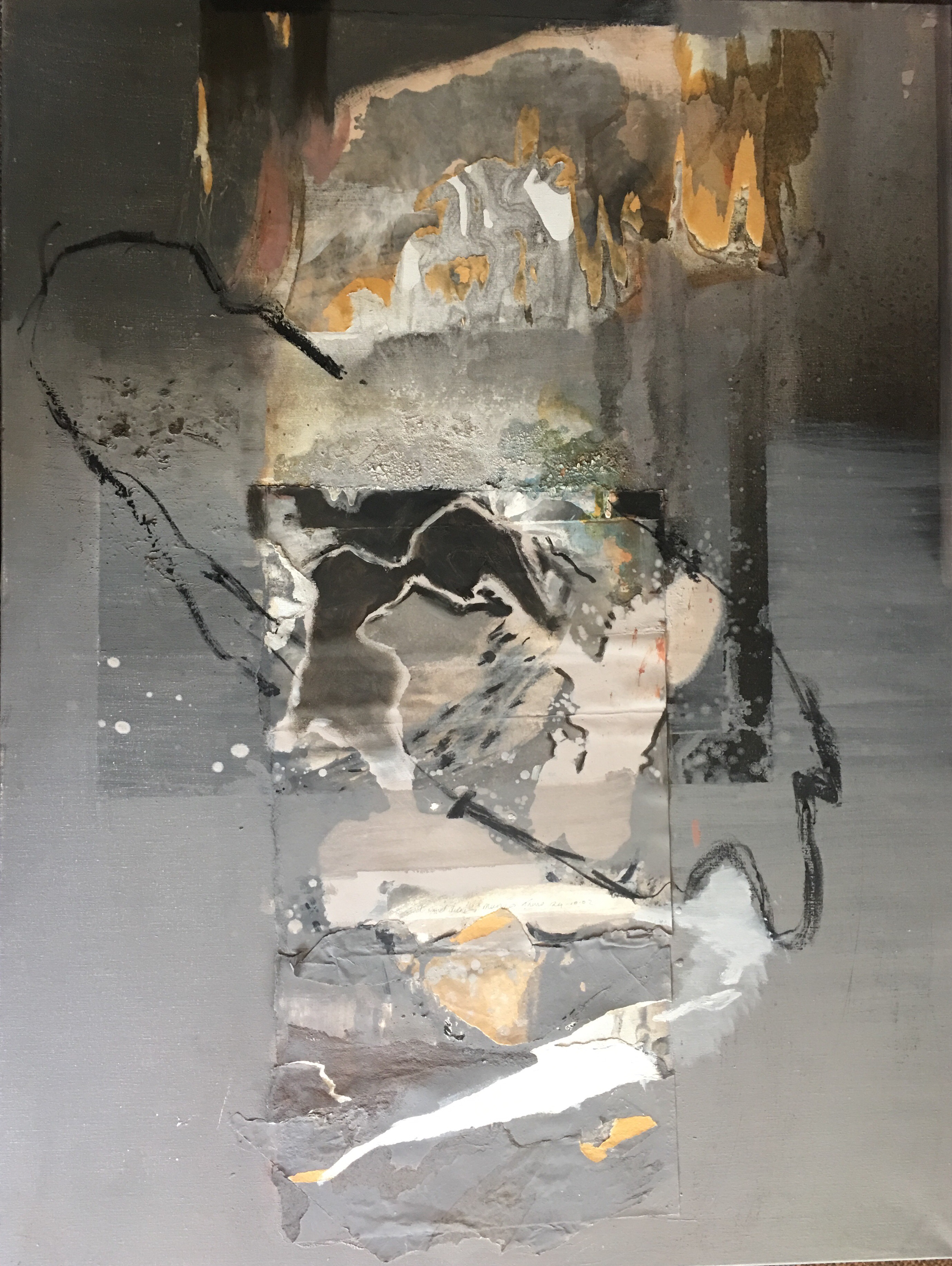 Both canvasses have been turned up side down. While I previously started the underpaintings differently, the paint texture and imagery that developed through pouring paint and drawing into it with an oil paint stick demanded re appraisal. Frottage beneath looked too much and unfocused but additional paint and colour made me re think aspects of the intended topic. Both were in the direction of listing soil types but too general and a bit waffly all over the place.