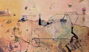 We both chose Miro’s The Hunter ( Catalan Landscape ) as a guide regarding the colour and aspects of the composition with colour and line elements taking precedence. Texture as an element was the background onto which lines and flat shapes were used to depict objects and figures. The dimension of the Miro was 60×90 cm approximately but my client’s painting required to measure 90×150 cm meant that too close a resemblance to the Miro would never work. Instead of a Catalan landscape I said I’d come up with something else and bring it up to Melbourne when the painting was in early stages and see if colour, composition and subject were acceptable because changing the size may have made colour intensity too much and space elements may spread, loosing compact design and focus. I wondered whether or not the sky’s intensity would be a bit overpowering transferred to a large canvas.
