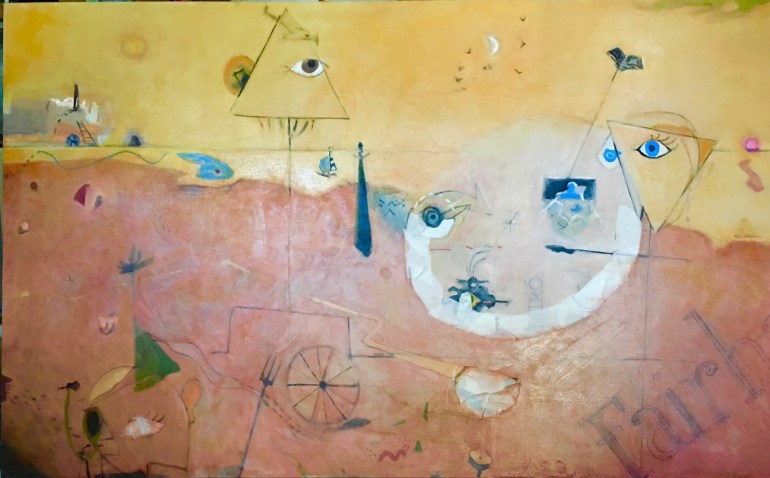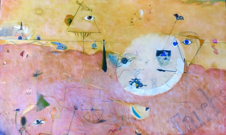 When this thoroughly dries I can glaze burnt sienna over it that should produce an orange brown. At this stage objects diminish as the colour takes over. Also felt that the composition required more balance on left side so I’m thinking of placing Miro’s octopus-like image floating in the sky of ‘Catalan Landscape’ in this spot. Once background colours dry all the interesting over painted detail can be emphasised in a graphic way. Still a way to go yet. Just trying to approximate the bruised but orange background and a quite acid but glowing yellow of the sky takes time because of successive layering but worth the effort.