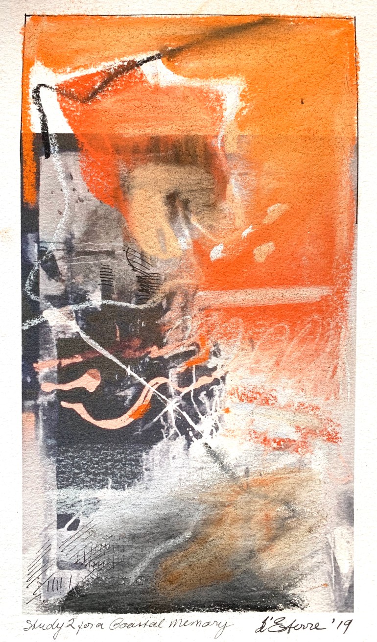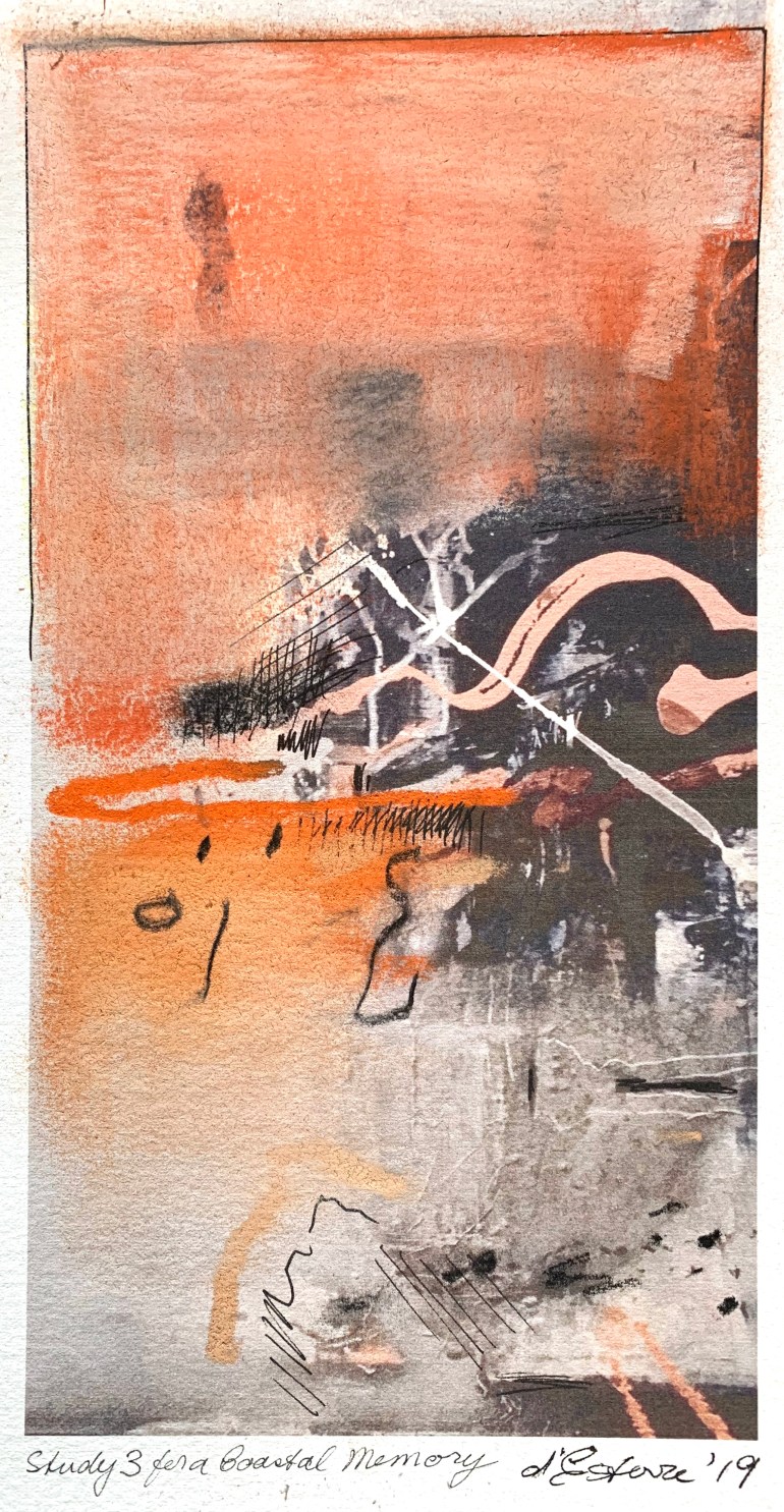 Anyway these three studies began unexpectedly as I pondered the feeling and memory of homesickness and the longing for colour, form and texture in particular places. When I lived in Western Queensland driving for kilometres through brigalow forest and experienced the flat endlessly stretching landscape and blue dome overhead I longed of orange, purple and grey tones of cliffs on the Great Ocean Road. So in Studies 1,2 and 3 for a Coastal Memory I have exaggerated the intensity of orange and made gestural marks that simplify form as a way to express a sense of loss.