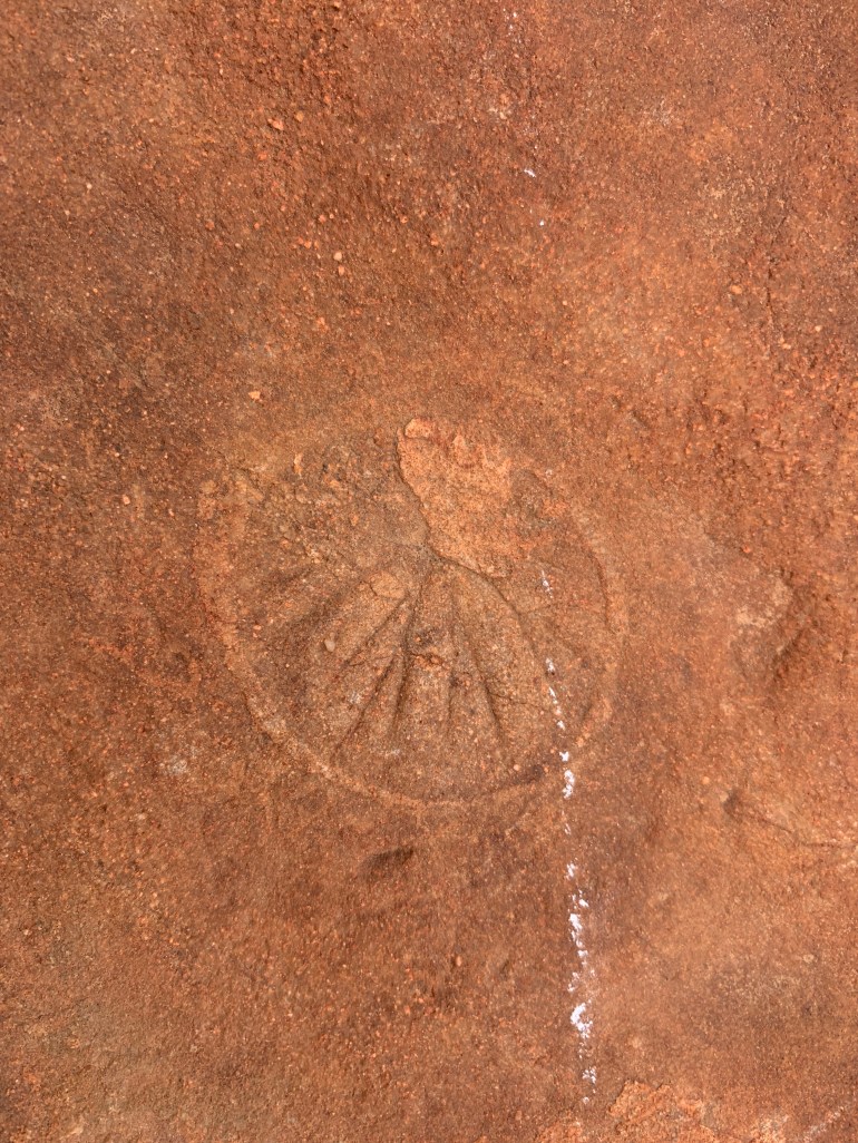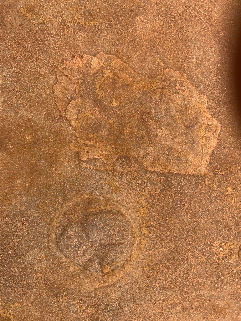 In the short time that we were there I scrambled to take rubbings or frottages that I insert into my artwork in my studio. So convenient here to see clearly as those in Brachina Gorge are more difficult due to geology where strata formed rocks are tilted vertically at right angles. Although a friend found a fossil in Parachilna Gorge washed down into the river-bed. A lucky find.
